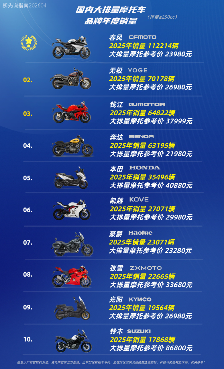 国内大排量摩托车品牌年度销量1至5名:春风、无极、钱江、奔达以及本田。春风动力稳居榜首,大排量摩托车年销约11.22万辆,销量较好的车型包括春风450SR、春风450CL-C等。它的成功是产品定义能力、技术研发储备、供应链垂直整合、营销用户生态以及精准定价策略等多重优势共同作用的结果。